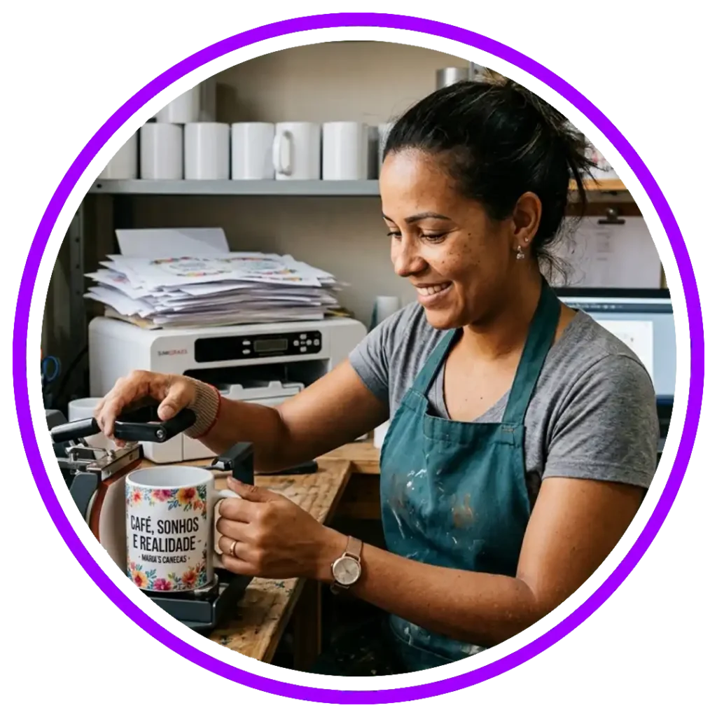 Carla Mendes é especialista em sublimação com mais de 15 anos de experiência. Ao longo da sua trajetória, ajudou milhares de sublimadores a vender mais e identificou uma das maiores dificuldades: a falta de artes prontas e tempo para criar.